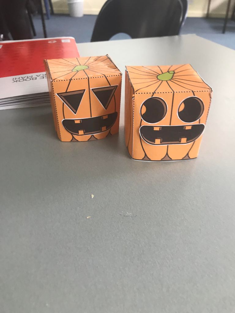I was interested in visiting this classroom as I am autistic and ADHD and am interested in special education as an area of teaching. When I first visited the classroom in term 2, I approached the students the way that I would have approached students in a mainstream classroom, that is I went around to each student and talked to them individually. However this did not work with these autistic kids as they are unsure about social cues and approaching them directly made them uncomfortable because they did not know how to react. None of them talked to me. So when I returned to the classroom I was mindful to take a different approach, that is to let the students come to me. On the first day I arrived the teacher gave the students a couple of options, colouring in pictures or doing some Halloween paper crafts. Instead of offering to help some of the students with their crafts I decided to take on of the more challenging crafts, making a cube jack o’lantern and do it myself. These sorts of tasks can be challenging to autistic kids who may or may not have the dexterity to put together an object such as this but may also struggle with the visualising a 3D object when they are only given a 2D piece of paper. After I had made my jack o’lantern, one of the students who had also been attempting to make one brought his paper over to me and asked me to finish cutting out his template. I suggested the next thing he might do might be to fold along the dotted lines. Once he had done that he was able to see from my jack o’lantern what it was supposed to look like and he was able to construct his.